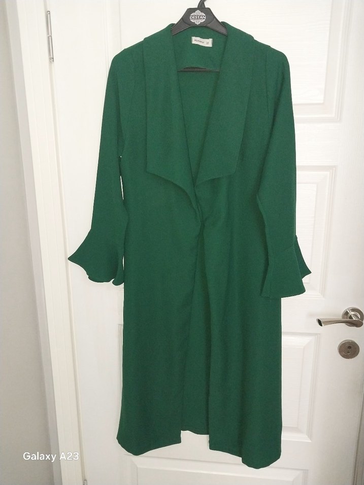 Uzun yeşil keten kaban, drapeli ve yakası kesik detaylıdır. Uzun kollu, regular fit, minimalist klasik şıklık için uygundur.