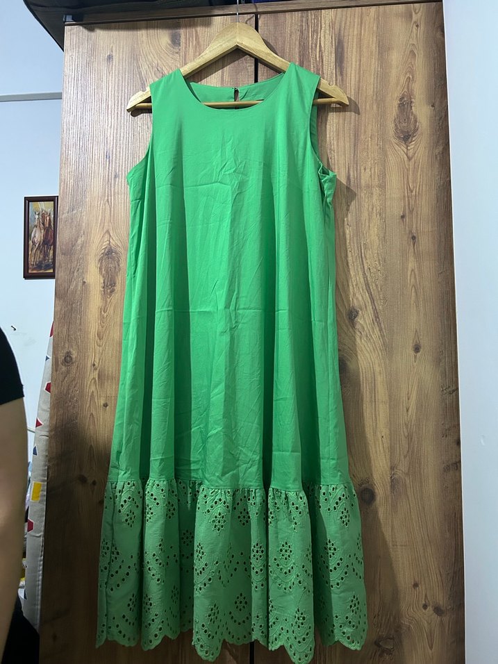 Yumuşak sentetik kumaştan, nakışlı fırfır etekli, bol kesim uzun yeşil kolsuz elbisedir. Canlı bohem tarzını yansıtır.