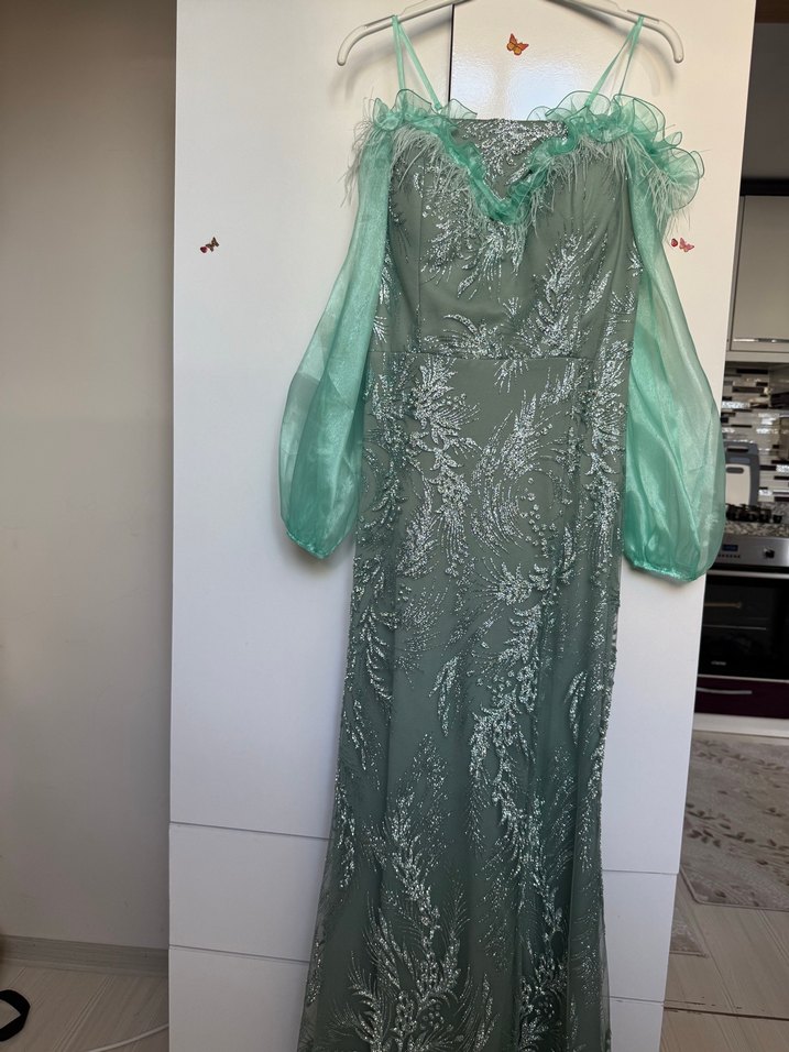 Uzun, dar kesim yeşil abiye elbise, straplez yaka ve drapeli, transparan kollar ile parlak nakış detaylarına sahip. Düğünler için ideal.