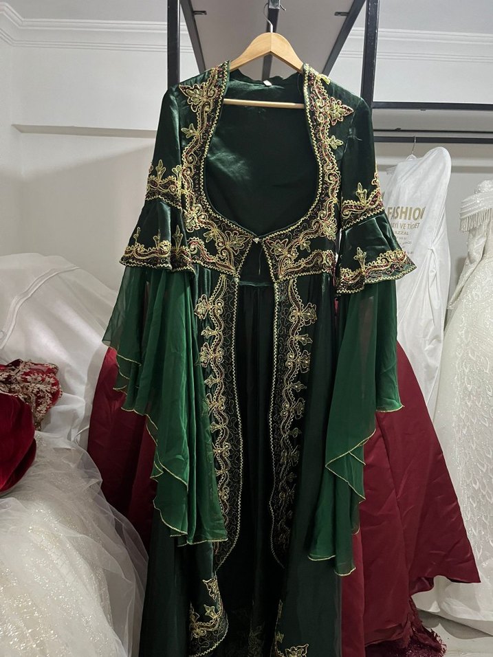 Uzun Yeşil Nakışlı Straplez Kadın Hint Elbisesi