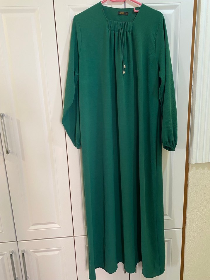 Uzun yeşil elbise, drapeli tasarımı, yüksek yakası ve uzun kolları ile salaş bir kesime sahiptir. Pürüzsüz sentetik kumaştan, sade ve günlük kullanıma uygundur.