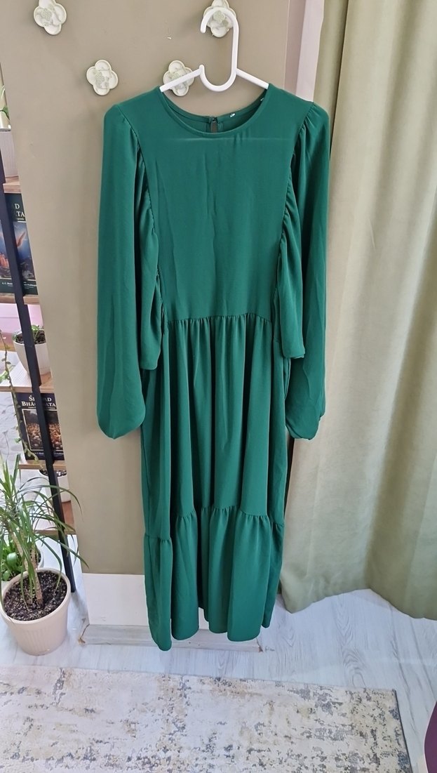 Uzun yeşil elbise, salaş kesim ve uzun kolludur. Fırfır detayları ve yuvarlak yakasıyla sade bohem tarzı sunar.