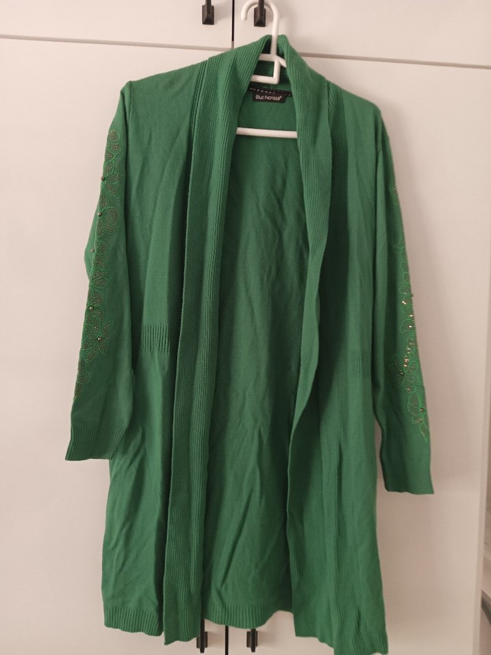 Uzun yeşil hırka, drapeli ve yaka detaylıdır. Uzun kollu, salaş kesim ve parlak sentetik kumaştan yapılmıştır. Günlük kullanıma uygundur.