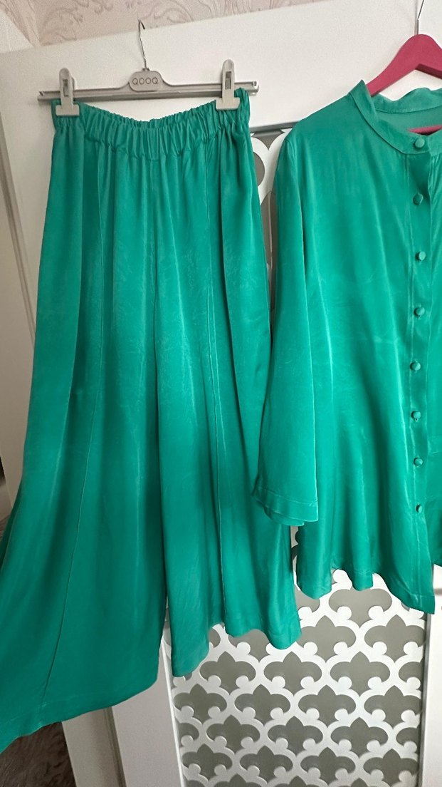 Uzun, saten yeşil elbise, dökümlü ve bol kesimdir. Uzun kollu, yakası çıtçıtlı ve parlak yapısı ile vintage bohem tarzını yansıtır. lastik bel