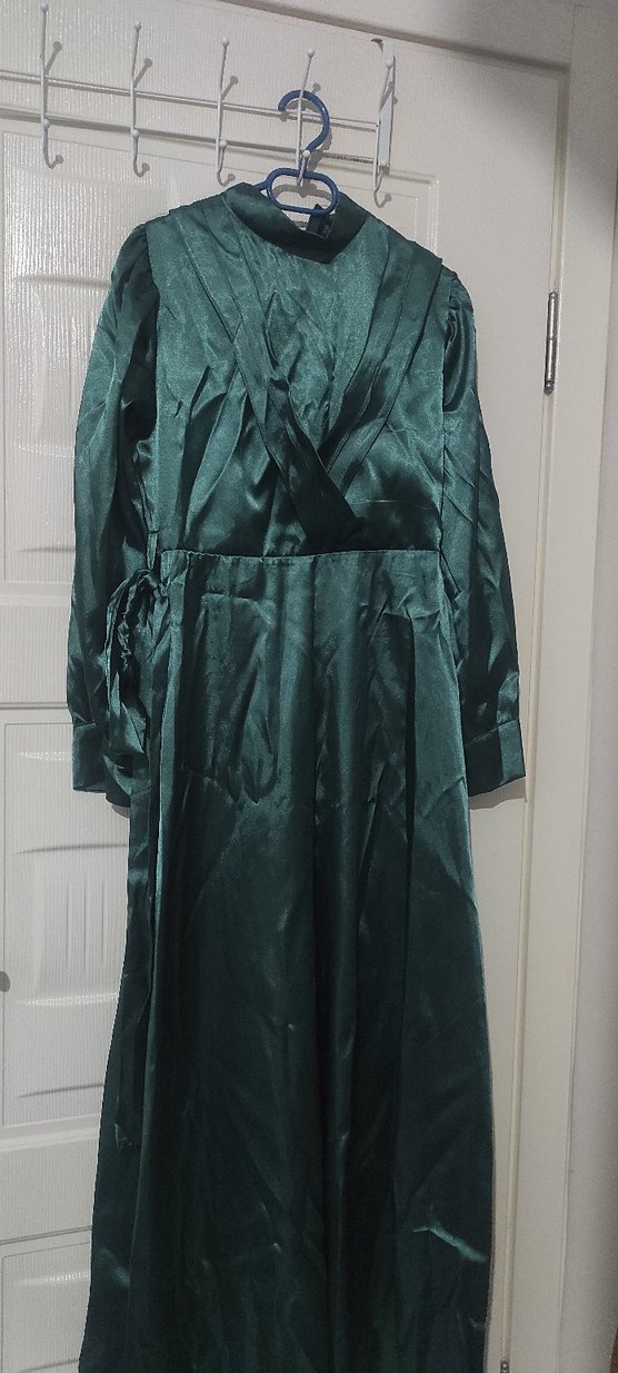 Zümrüt yeşili parlak saten bir abiyedir. Kuşak detayı vardır. Yeni ve Etiketlidir. Sadece ütü ister. 36 beden için uygundur.