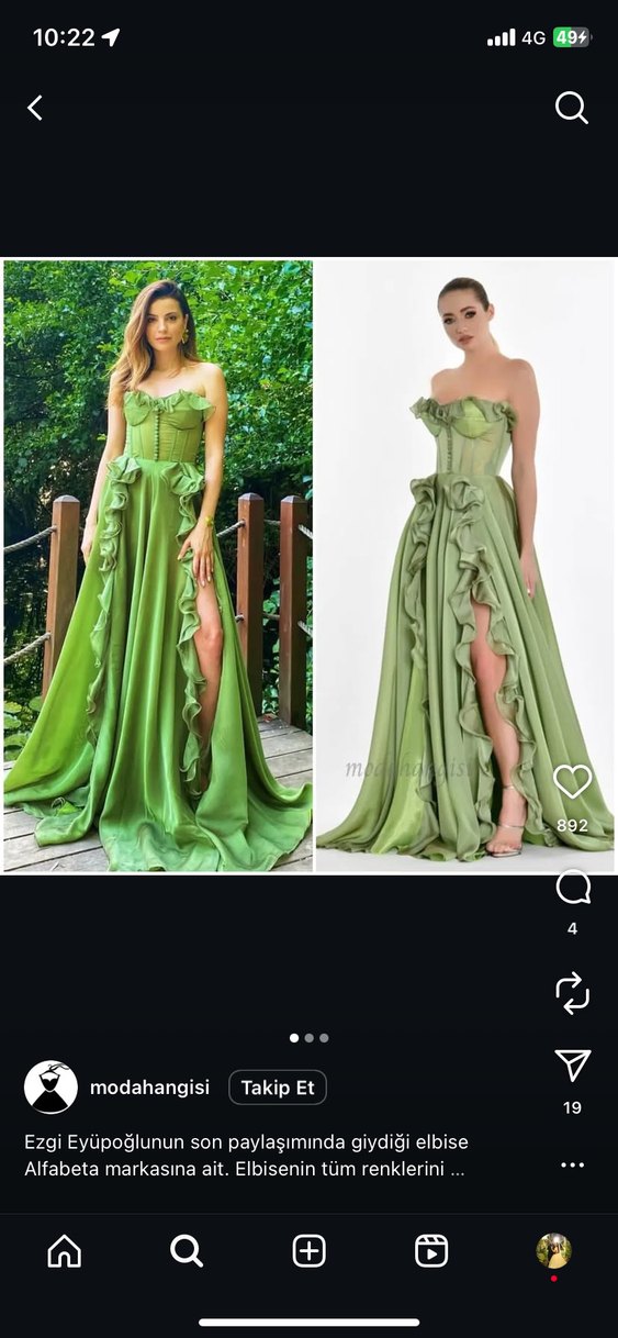 Uzun, yeşil, straplez ve drapeli detaylara sahip, parlak yüzeyli, düğünler için uygun abiye elbise. Uç ön kısmında deformeler mevcuttur. Eteğin bir noktasında da ufak nokta kadar ip kaçması vardır. İkiside belli olmamaktadır etek uçuş uçuş çünkü. İsteyene detaylı fotoğraf atarım. Beden 36-38 arası olur arkadı ipli. Orjinal alfabeta markadır.