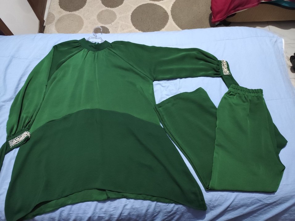 Uzun, bol kesim tesettür takım yüksek yakalı ve uzun kolludur. Parlak sentetik kumaştan üretilmiş olup, dökümlü ve sade, mütevazı bir tarza sahiptir. beden olarak 1beden yazıyor