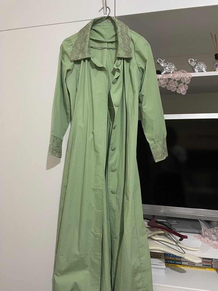 Uzun yeşil keten kaban, drapeli tasarımı ve kesik yakası ile vintage bohem tarzında, rahat ve günlük kullanıma uygun mükememl dantel detayları var 36-38 bedene uygundur