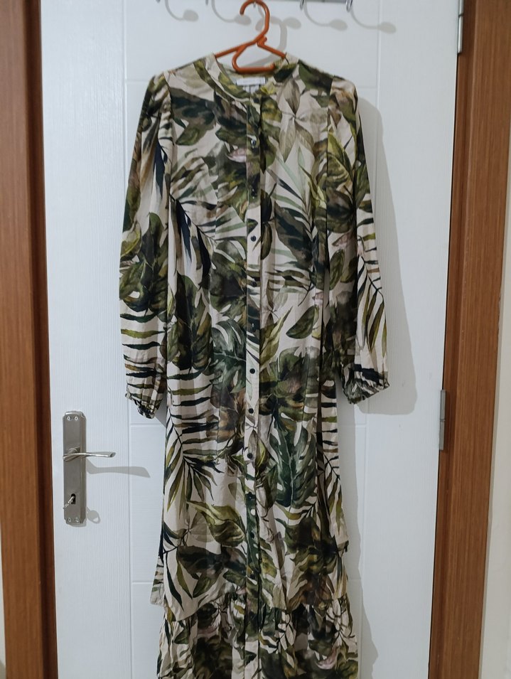 Yüksek yakalı ve uzun kollu, bol kesim uzun elbise. Sentetik kumaştan yapılmış, yeşil yaprak desenli ve pile detaylı, günlük kullanım için bohem tarzda.