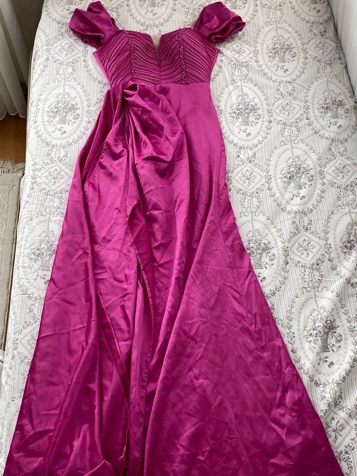 Uzun yırtmaçlı ve kuyruklu pembe abiye