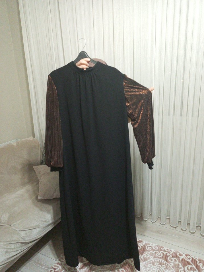 Yüksek yakalı, uzun kahverengi kollu, dökümlü ve bol kesim elbisedir. Ofis için uygun, koyu tonlarda gotik tarzda bir modeldir. sıfırdan farksız ihtiyac fazlası