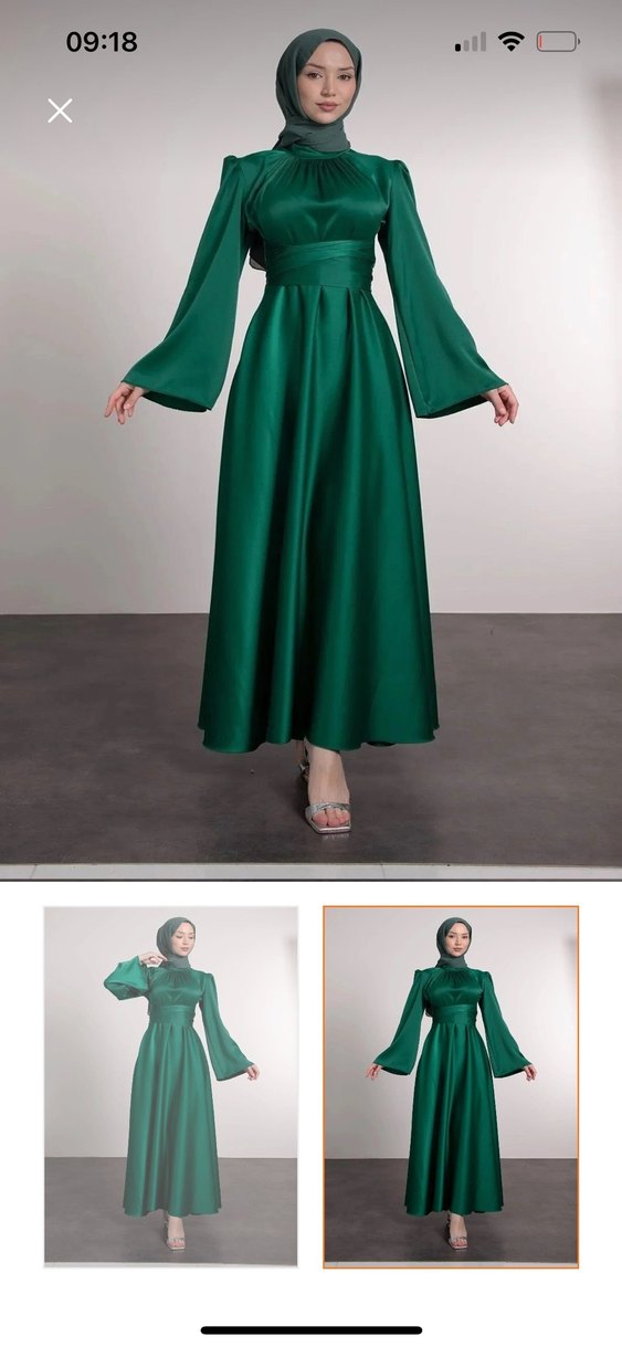 Yüksek yakalı, uzun kollu ve koyu yeşil renkte, ipeksi dokulu, drapeli uzun elbise. Minimalist ve mütevazı tarzda, rahat kesimle günlük kullanıma uygun. 90 90 cm aynı kumaştan kestirip eşarp olarak kullandım onu da göndereceğim. İki kere giydim