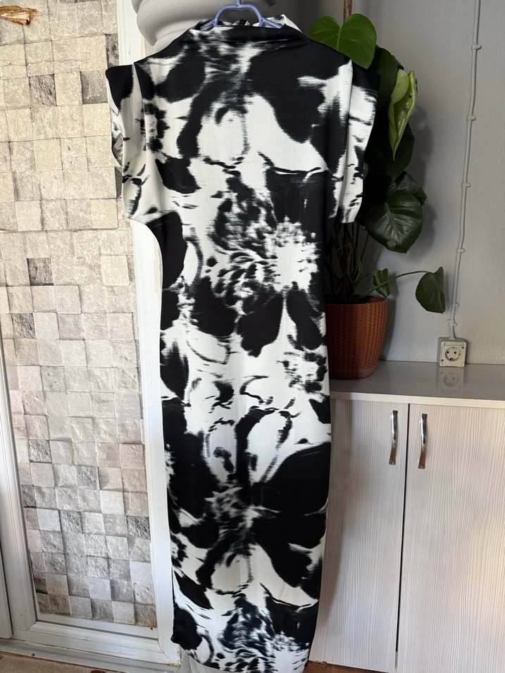 Siyah beyaz karışık batik desenli, kısa kollu ve drapeli uzun, yuvarlak yakalı, sentetik kumaştan yapılmış modern kesim elbise.