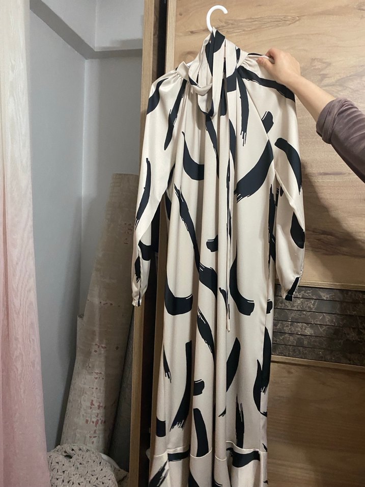Uzun, salaş kesim zebralı elbise, yüksek yakalı ve uzun kolludur. Sentetik kumaştan, çağdaş tarzda tasarlanmıştır.