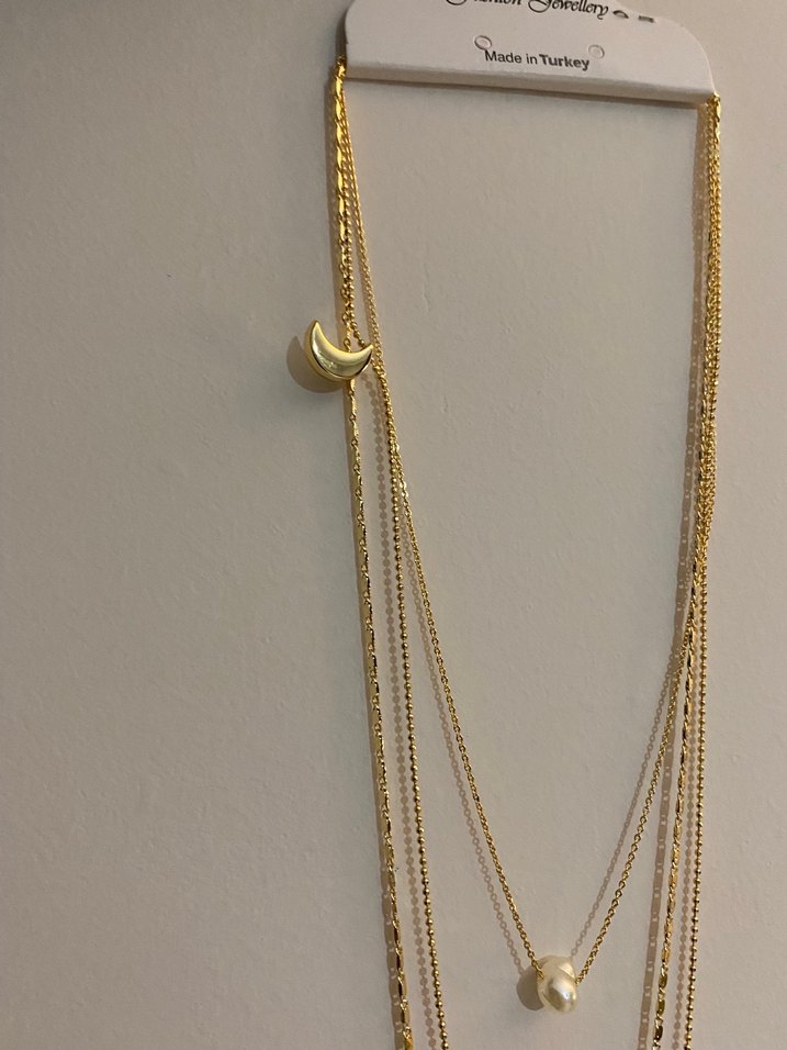 Kadınlar için parlak altın renkli, uzun zincir detaylı kolye. Minimalist bohem tarzda, ay ve inci figürlü, günlük kullanıma uygun.