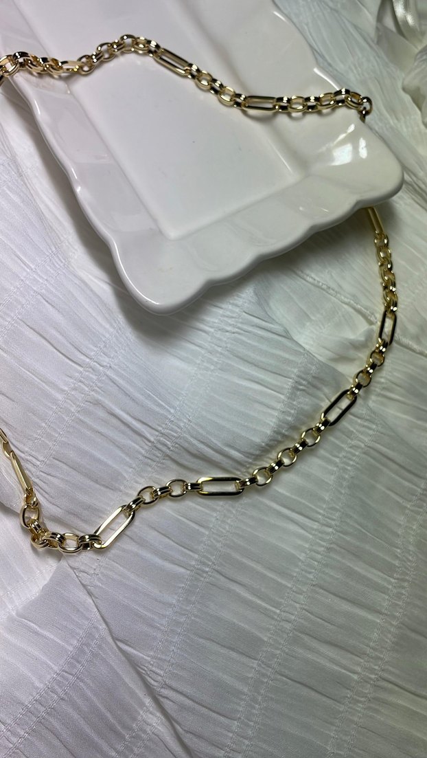 Bu uzun altın kolye, zincir detayları ve parlak yüzeyi ile gündelik kullanıma uygun çağdaş ve minimalist bir görünüm sunar. ✨