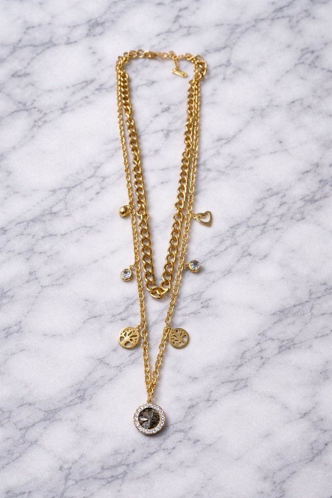 Uzun altın zincir detaylı bu kadın kolye, küçük figürler ve merkezi bir kolye ucu ile klasik zarafet ve bohem dokunuşu bir araya getirir. Günlük kullanıma uygundur. ✨