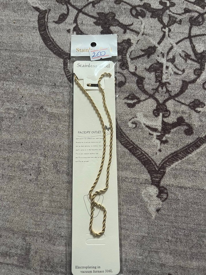 Uzun uzun zincir detaylı, altın renkli paslanmaz çelikten kadın kolye. Parlak yüzeye sahip, minimal ve sokak stili, günlük kullanım için uygundur. ✨