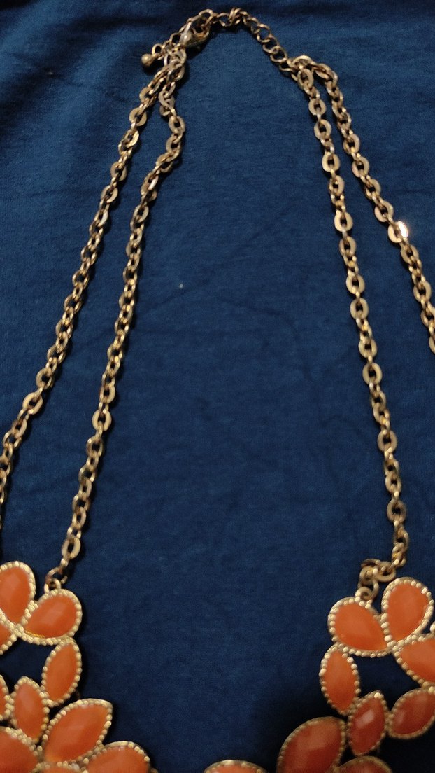 Uzun zincir detaylı, turuncu nakışlı çiçek desenli altın renkli bohem ve vintage tarzda kolye.