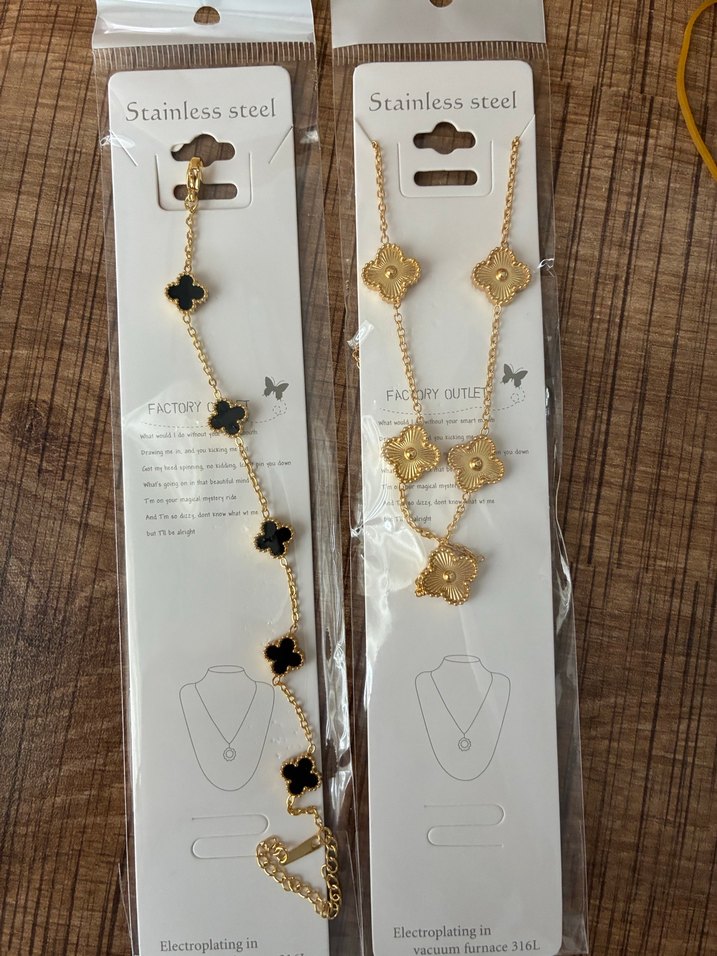 Uzun uzun zincir detaylı, altın renkli, baskılı yonca desenli paslanmaz çelik bohem tarz kolye, günlük kullanım için uygun.