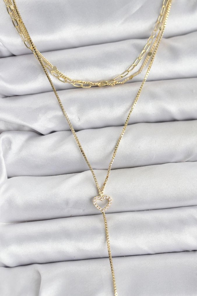 Uzun zincir detaylı, altın renkli kadın kolyesi, kalp figürlü ucu ile bohem ve minimalist tarzları birleştirir.