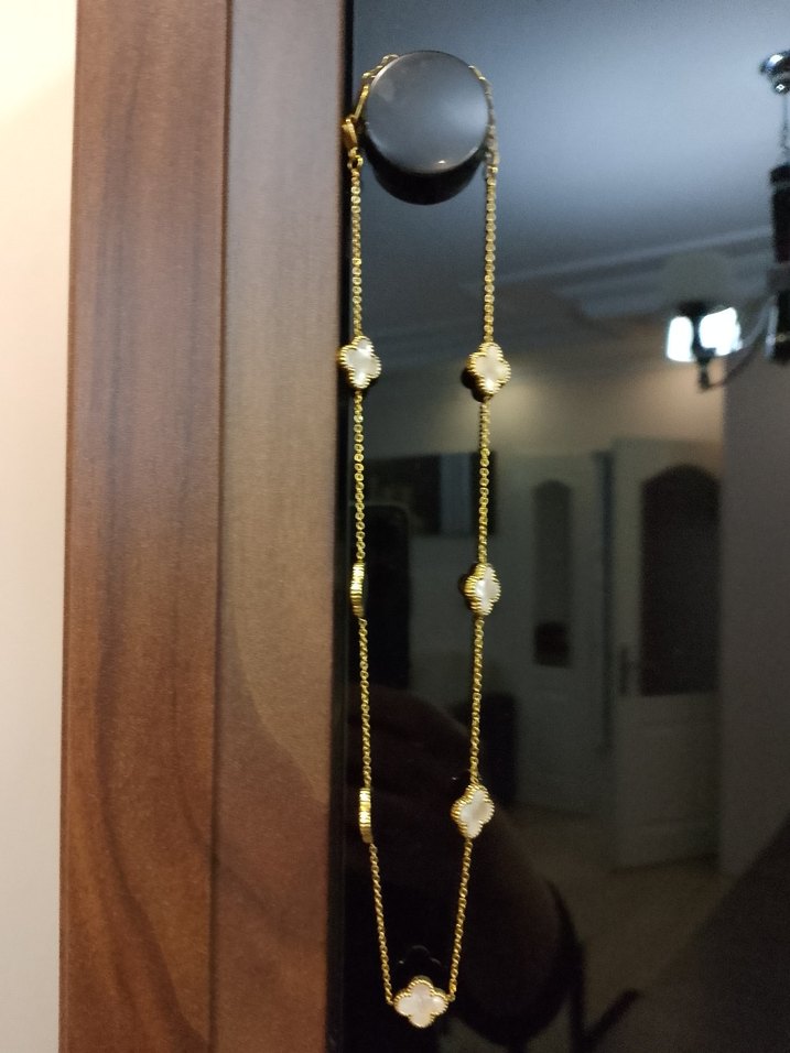 Uzun zincir detaylı, altın renkli kadın kolyesi. İşlemeli desen ve parlak yüzeye sahip, minimalist ve çağdaş tarzda günlük kullanıma uygun.