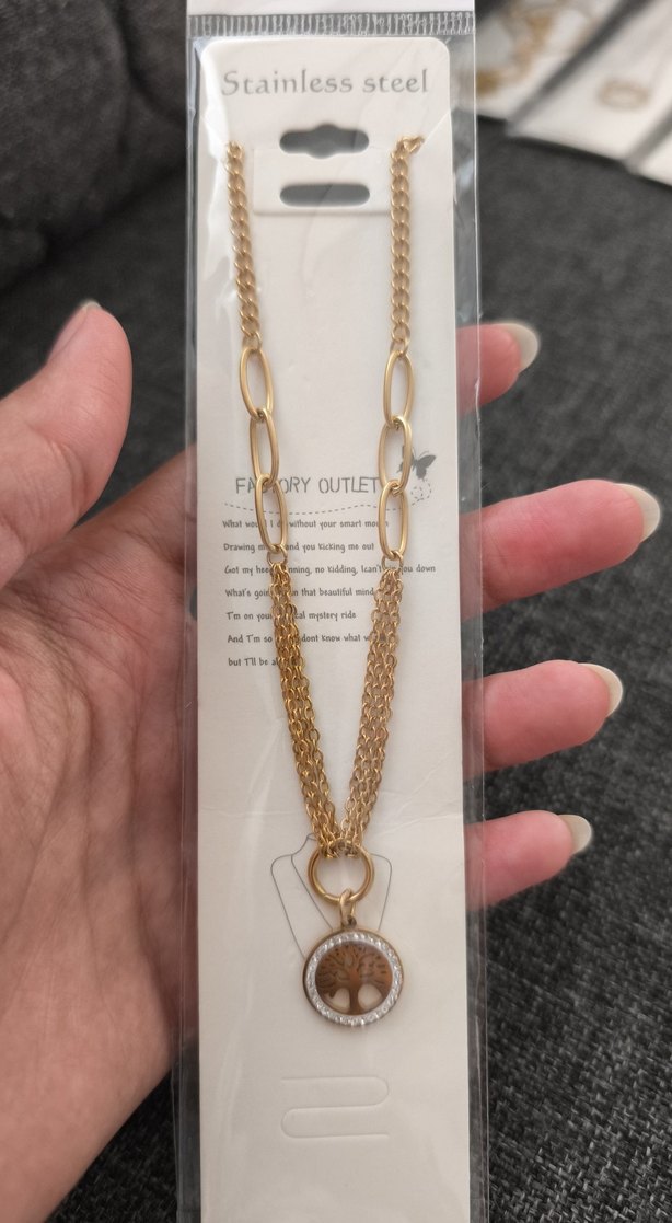 Diger markanın uzun, parlak altın renk zinciri detaylı halkalar ve baskılı ağaç figürlü yuvarlak kolye ucuna sahiptir. Rahat bohem tarzda günlük kullanıma uygundur. ✨