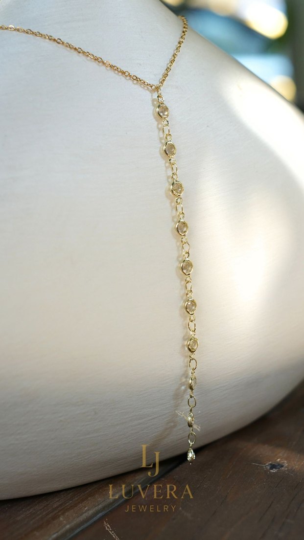 Uzun uzunlukta altın renkli, zincir detaylı, minimal ve bohem tarzda, düğün için uygun kolye. ✨