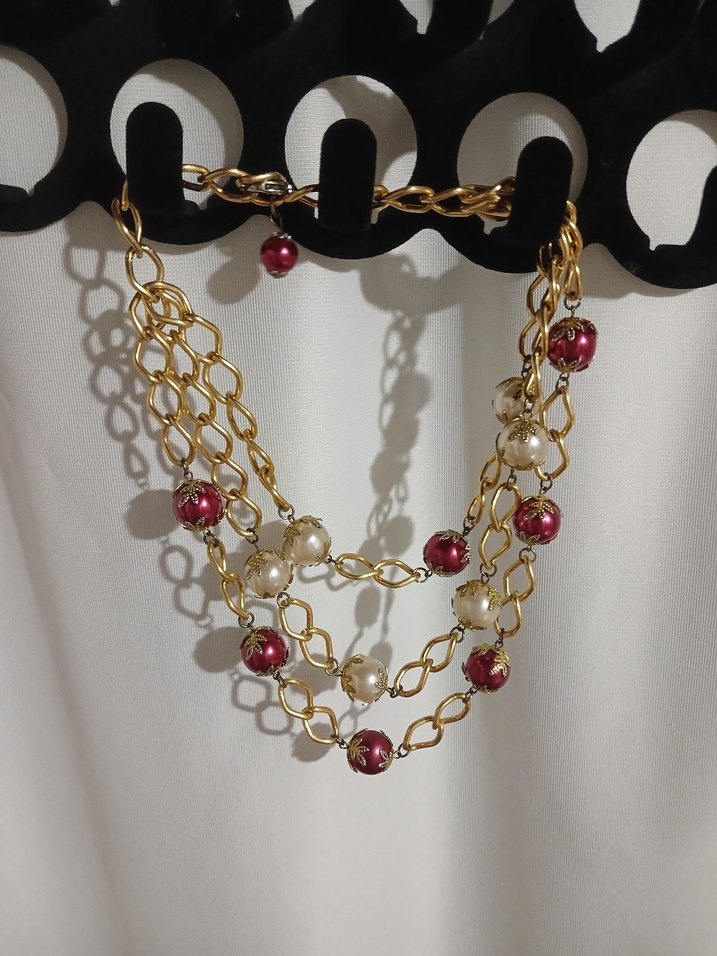 Uzun zincir detaylı, kırmızı ve beyaz desenli boncuklarla süslenmiş altın renkli kolye, günlük kullanım için bohem ve ışıltılı bir tarz sunar.