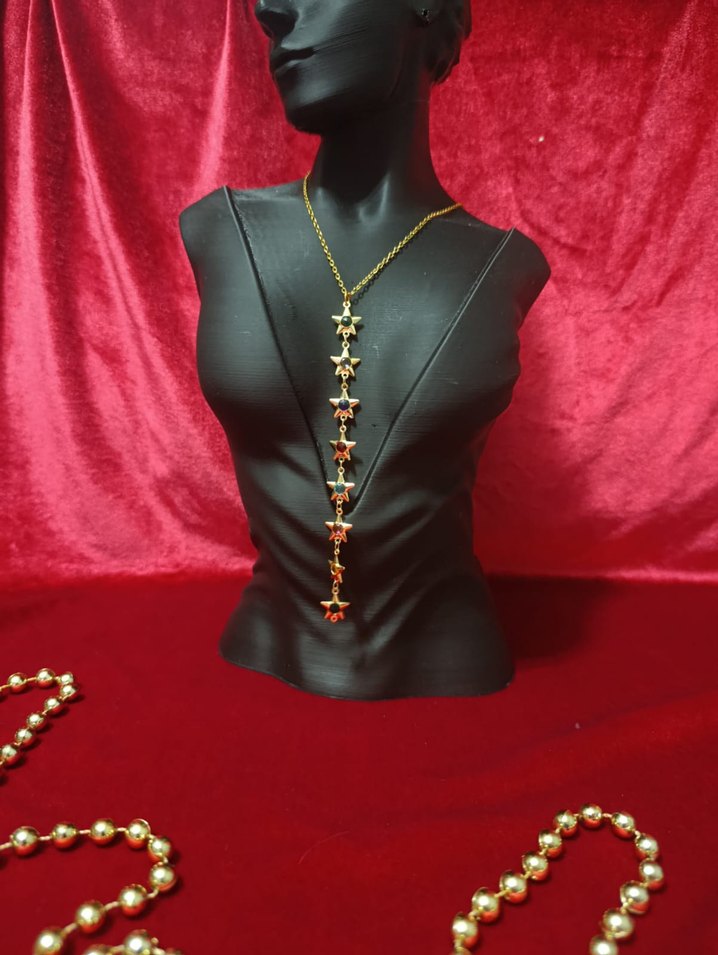 Uzun uzun zincir üzerinde bağlama desenli yıldız figürlü altın renkli gotik kolye. Cesur ve gösterişli tarzlar için uygun. ✨