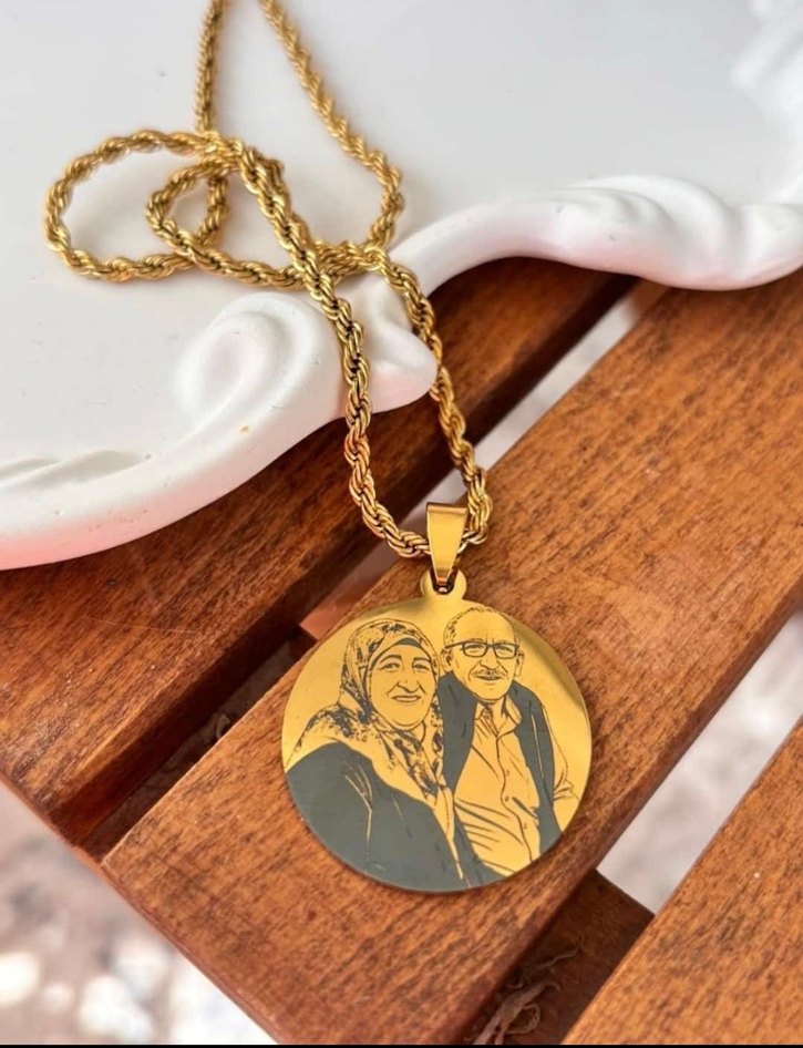 İstediğiniz fotoğrafınızı plakalara yerleştiriyoruz Uzun zincir detayına sahip, parlak yuvarlak kolye ucu üzerinde vintage tarzda baskılı portre bulunan altın renkli kadın