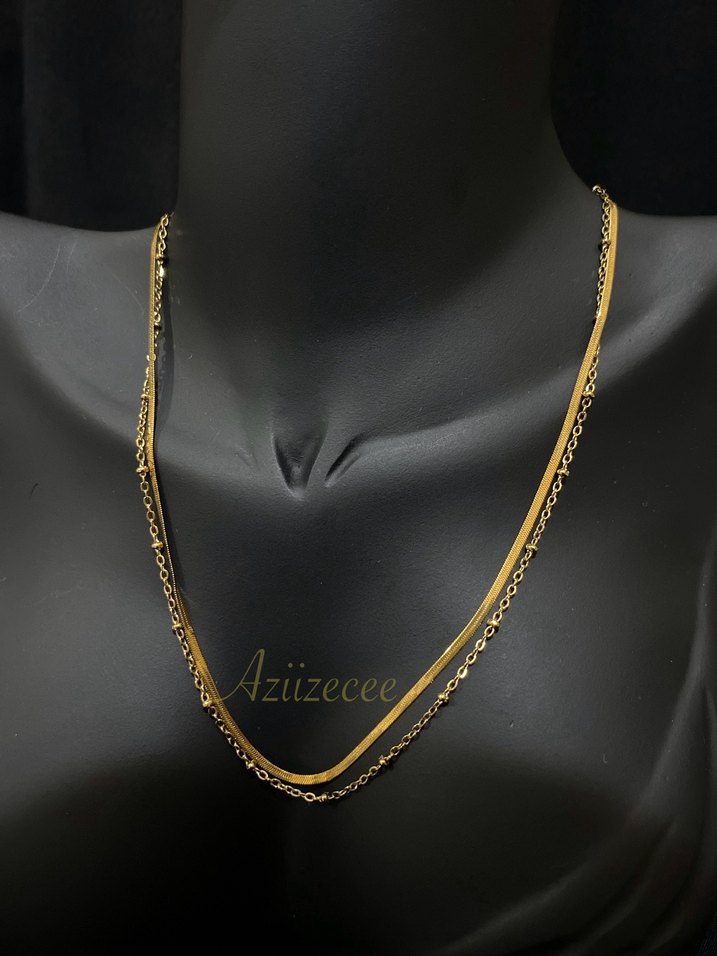 Uzun uzunlukta, altın renkli zincir detayları ve yılan deseni bulunan, cesur minimalist sokak stili için uygun kolye. Günlük kullanıma uygundur.