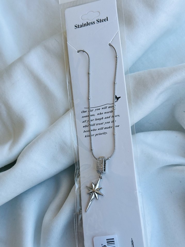 Uzun zincir detaylı, parlak beyaz renkte, paslanmaz çelikten yapılmış minimalist kadın kolye. Yıldız formunda kolye ucu bulunur. ✨
