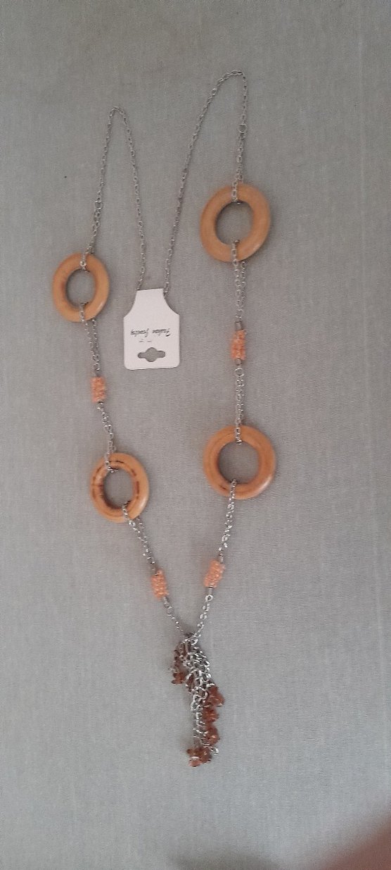 Uzun uzunlukta, zincir detaylı ve ahşap halkalı bej renkte bohem tarzda kadın kolye.