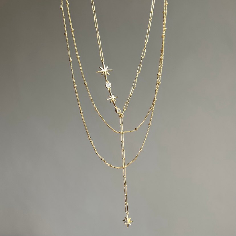 Uzun altın kolye, detaylı zincirler ve nakışlı yıldız desenleriyle bohem ve minimal tarzı yansıtır, günlük kullanım için uygundur. ✨