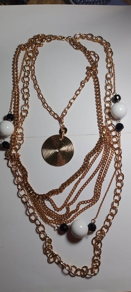Uzun uzunluğu ve desenli boncuklarıyla detaylı zincirlerden oluşan bu altın renkli kolye, bohem ve avangard tarzı yansıtıyor. ✨