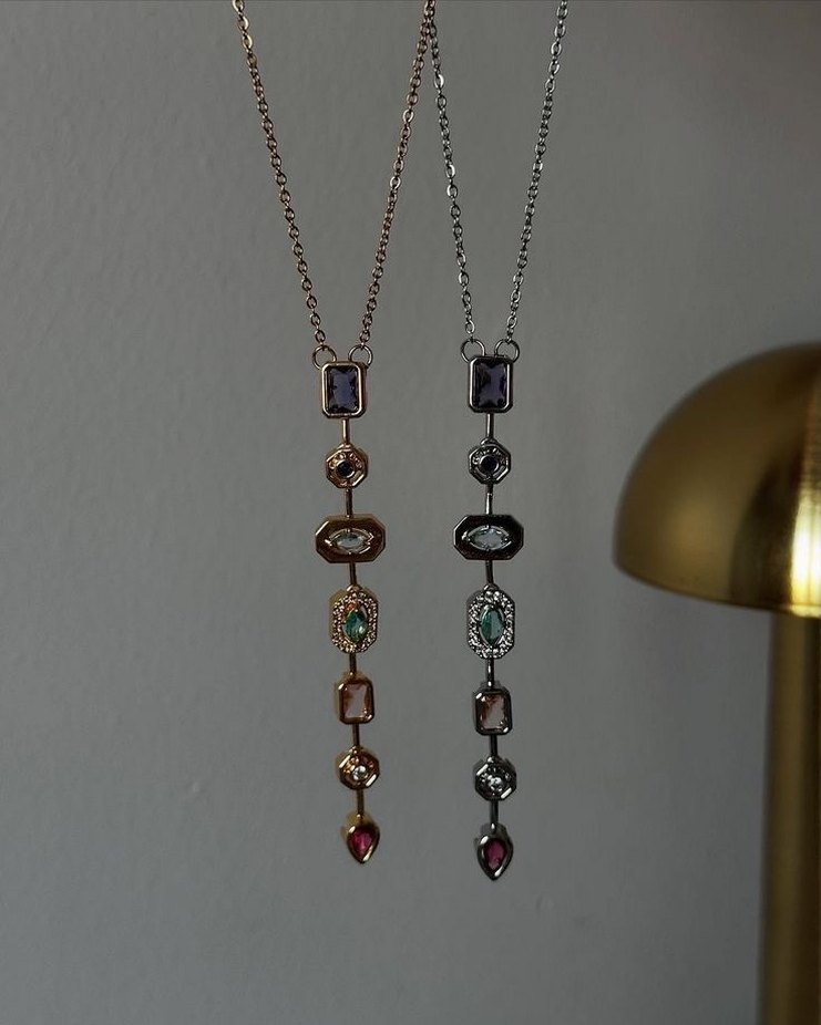 Uzun zincir detaylı, çok renkli işlemeli taşlarla süslenmiş bohem ve gösterişli kadın kolyesi, romantik akşamlar için ideal.