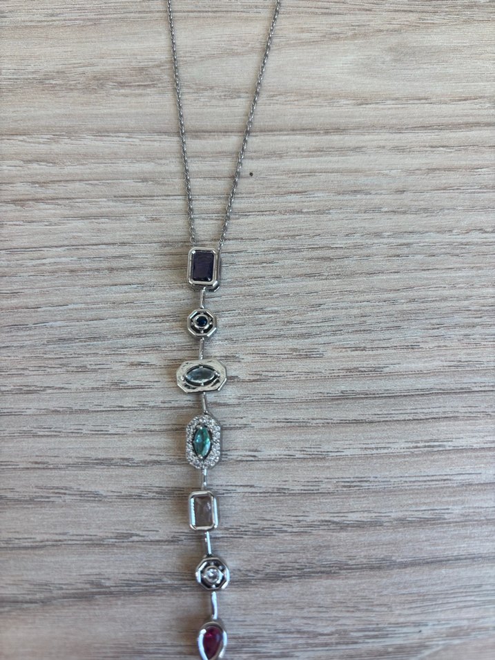 Uzun gri zincir üzerinde çok renkli nakışlı taşlar bulunan bohem tarzda kadın kolye, romantik akşamlar için uygundur.