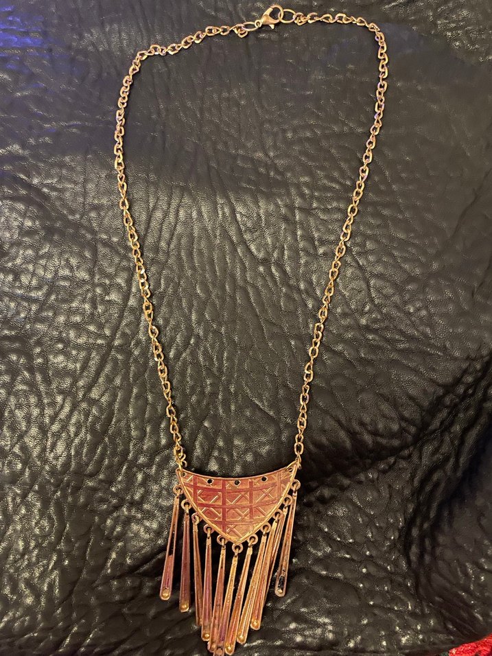 Uzun zincir ve nakışlı üçgen kolye ucu ile detaylandırılmış, günlük kullanım için uygun altın renkli bohem kadın kolyesi.