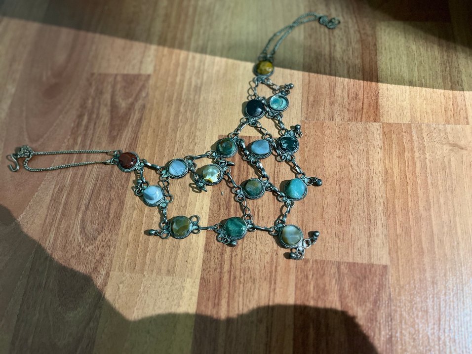 Uzun zincir detaylı, koyu turkuaz tie-dye taşlarla süslenmiş bohem tarzda kolye, günlük kullanıma uygun. 2 ADET BONCUĞU KOPMUŞ DIRUMDA 1 İ VAR DİĞERİ YOK BONCUĞUN