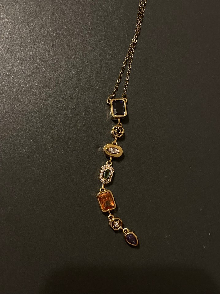 Uzun zincir detaylı, çok renkli taşlı bohem tarzda yılan desenli kolye. Koyu tonlarda, romantik akşamlar için uygun.