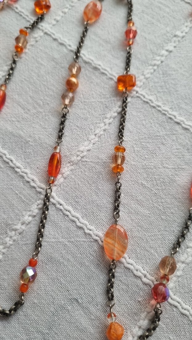 Uzun uzunlukta, zincir detaylı ve çok renkli işleme boncuklarla süslenmiş kadın kolyesi, günlük kullanım için uygundur.