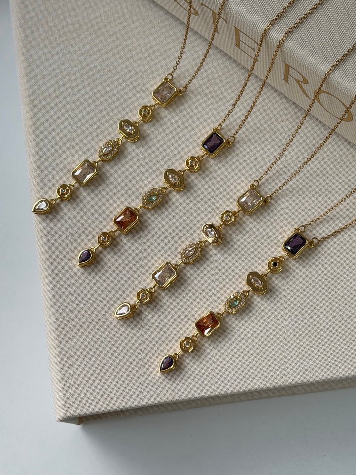 Uzun zincirli, çok renkli taşlarla işlenmiş detaylı kolye. Bohem tarzıyla klasik zarafeti birleştirir, günlük kullanıma uygundur. Ürünler çeliktir kararma solma yapmaz