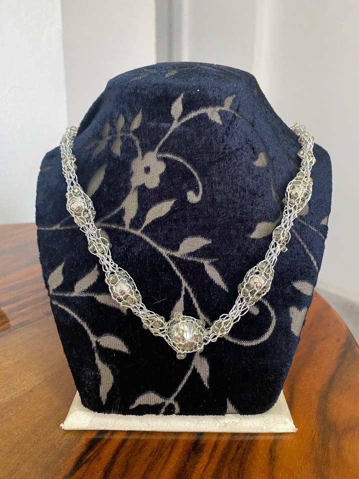 Uzun gri kolye, zincir detayları ve nakışlı vintage bohem tarzıyla düğünler için uygundur.