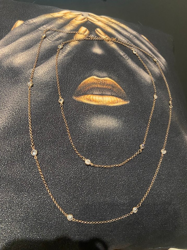 Uzun uzunlukta, zincir detaylı ve küçük taşlarla süslenmiş altın renkli kolye. Minimalist ve bohem tarzıyla günlük kullanıma uygun klasik zarafet sunar. ✨