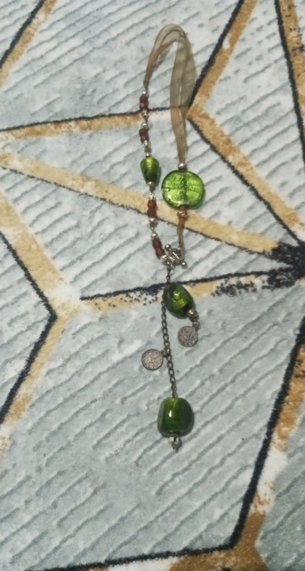 Uzun zincir detaylı, yeşil boncuklu haki tonlarında bohem tarzda kolye. Günlük kullanıma uygun yılan deseni bulunur.