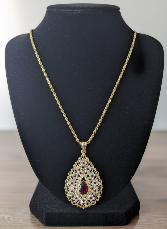 Uzun zincir detaylı altın kolye, işlemeli ve kırmızı taşlı büyük bir kolye ucu ile düğünler için uygundur. inst:ada__taki