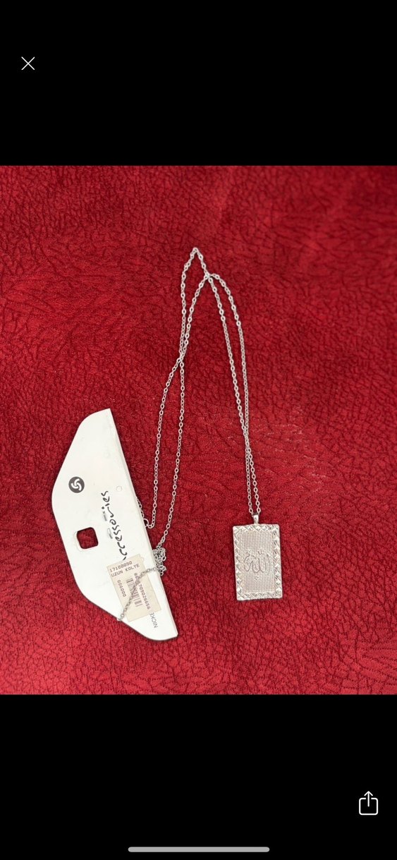 Uzun zincir detaylı, gri ve kırmızı tonlarda işleme desenli dikdörtgen kolye, günlük sokak stiline uygun minimal tasarım.