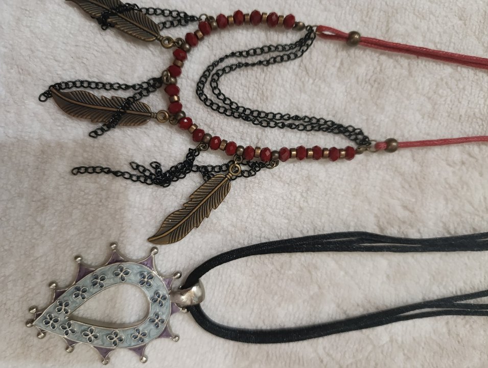 Uzun uzunlukta, kırmızı işlemeli boncuklar ve tüy figürlü koyu zincir detaylı bohem tarzda kolye.