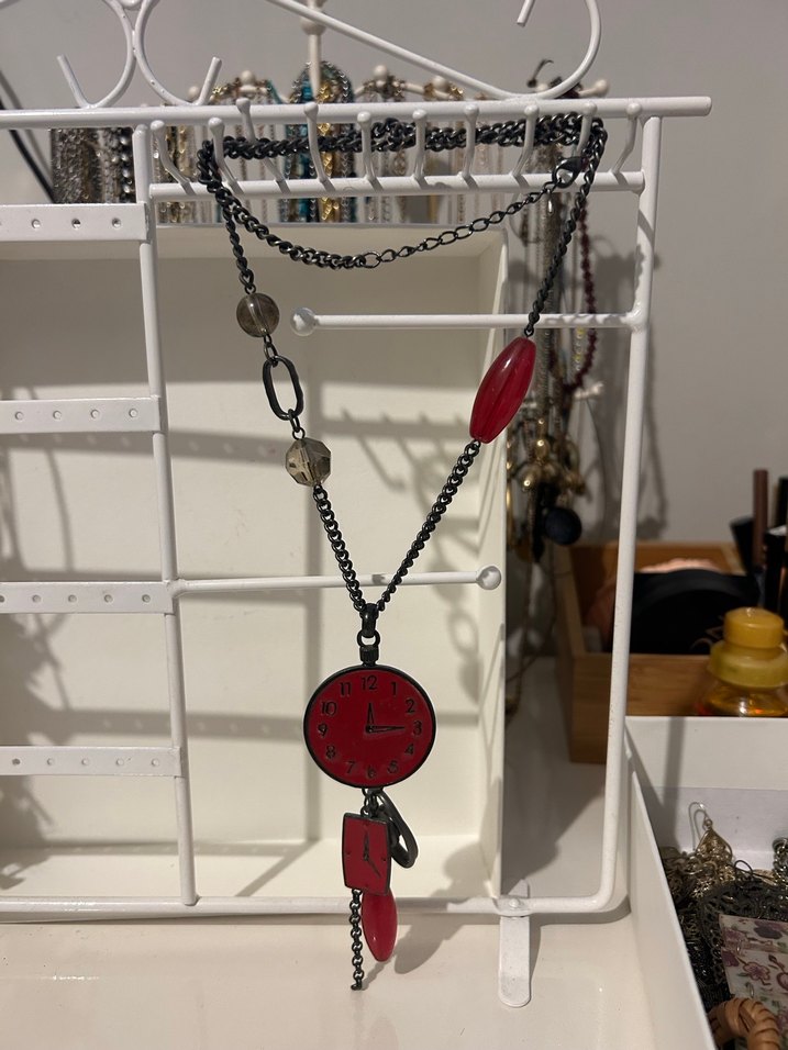 Uzun zincir detaylı, kırmızı baskılı vintage tarzda bir kolye. Günlük kullanıma uygun, bohem ve retro stillerle uyum sağlar.